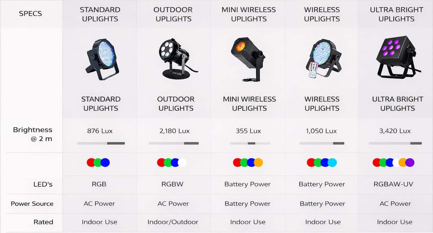 Each uplight weighs just 3 pounds, making setup quick and stress-free. Rear power connections allow you to daisy-chain units together, keeping cords tidy and your layout clean.